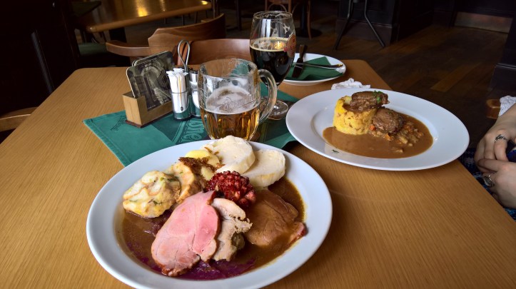 On the left: an assortment of pork meat with škvarkový dumplings. On the right: pork knee with seasoned mashed potatoes. Czechs have a superpower which allows them to leave no sauce on the plate.