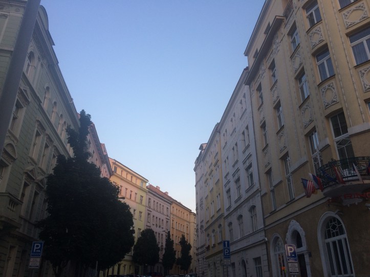 We stayed at Penzion 15 in Prague 3 (Žižkov). It was about a 10-15 minute walk from the main train station, but it’s not super fun when it’s uphill and 28 degrees Celsius (82.4 Fahrenheit) outside. It was a fine, and economical, place to stay (1400czk for 2 nights) and it gave us a nice although somewhat foggy sunset view: