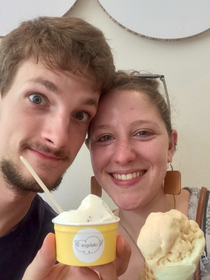 Ondra has stracciatella, and I have sea-salt caramel and olive oil &basil. (Sounds weird, but was delicious.)