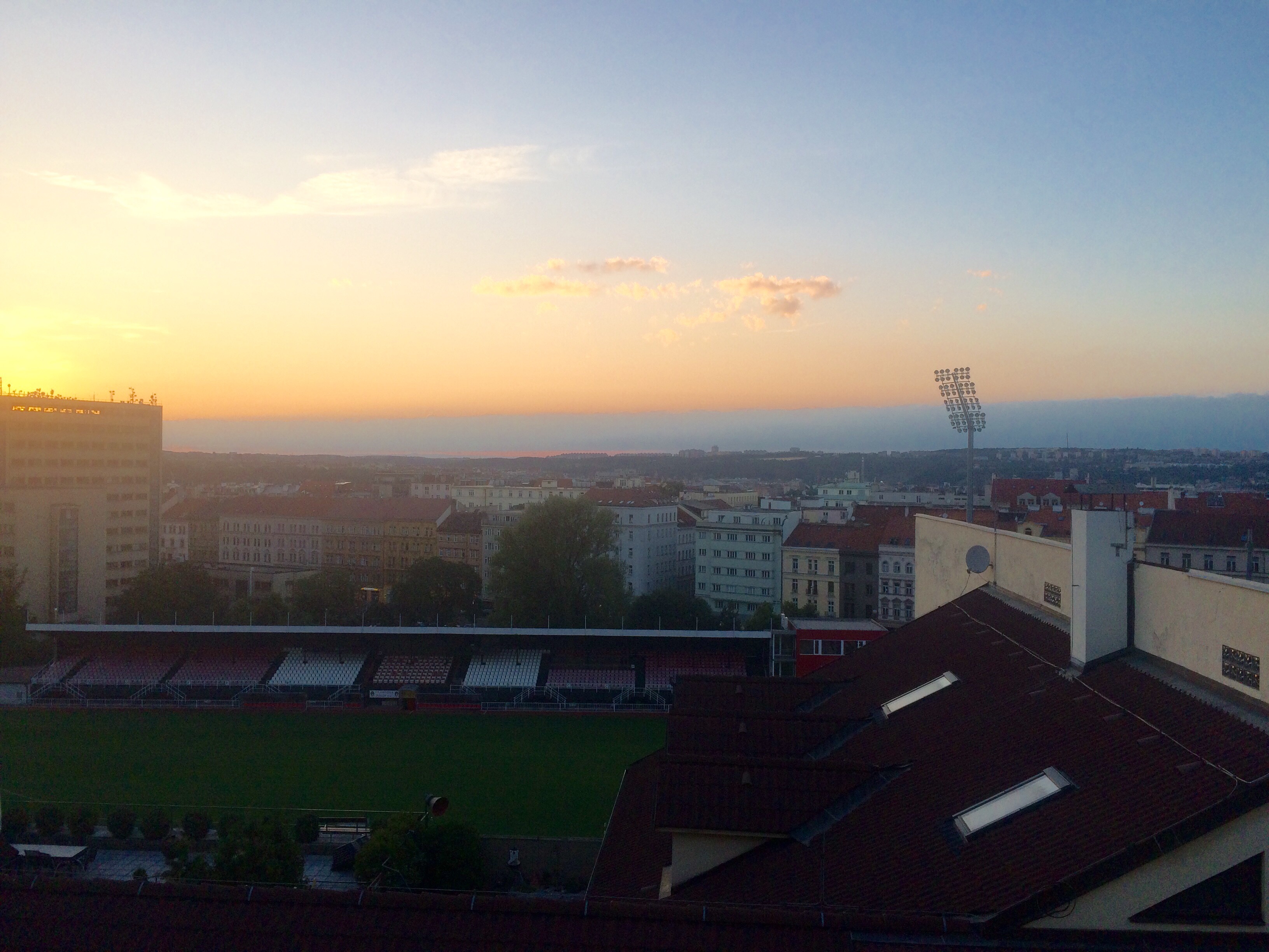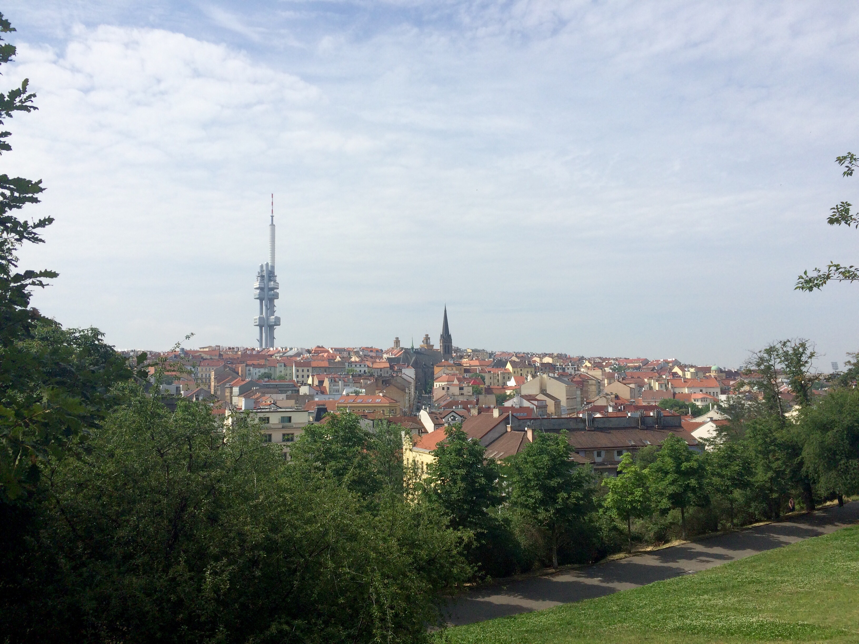 We stayed at Penzion 15 in Prague 3 (Žižkov). It was about a 10-15 minute walk from the main train station, but it’s not super fun when it’s uphill and 28 degrees Celsius (82.4 Fahrenheit) outside. It was a fine, and economical, place to stay (1400czk for 2 nights) and it gave us a nice although somewhat foggy sunset view: