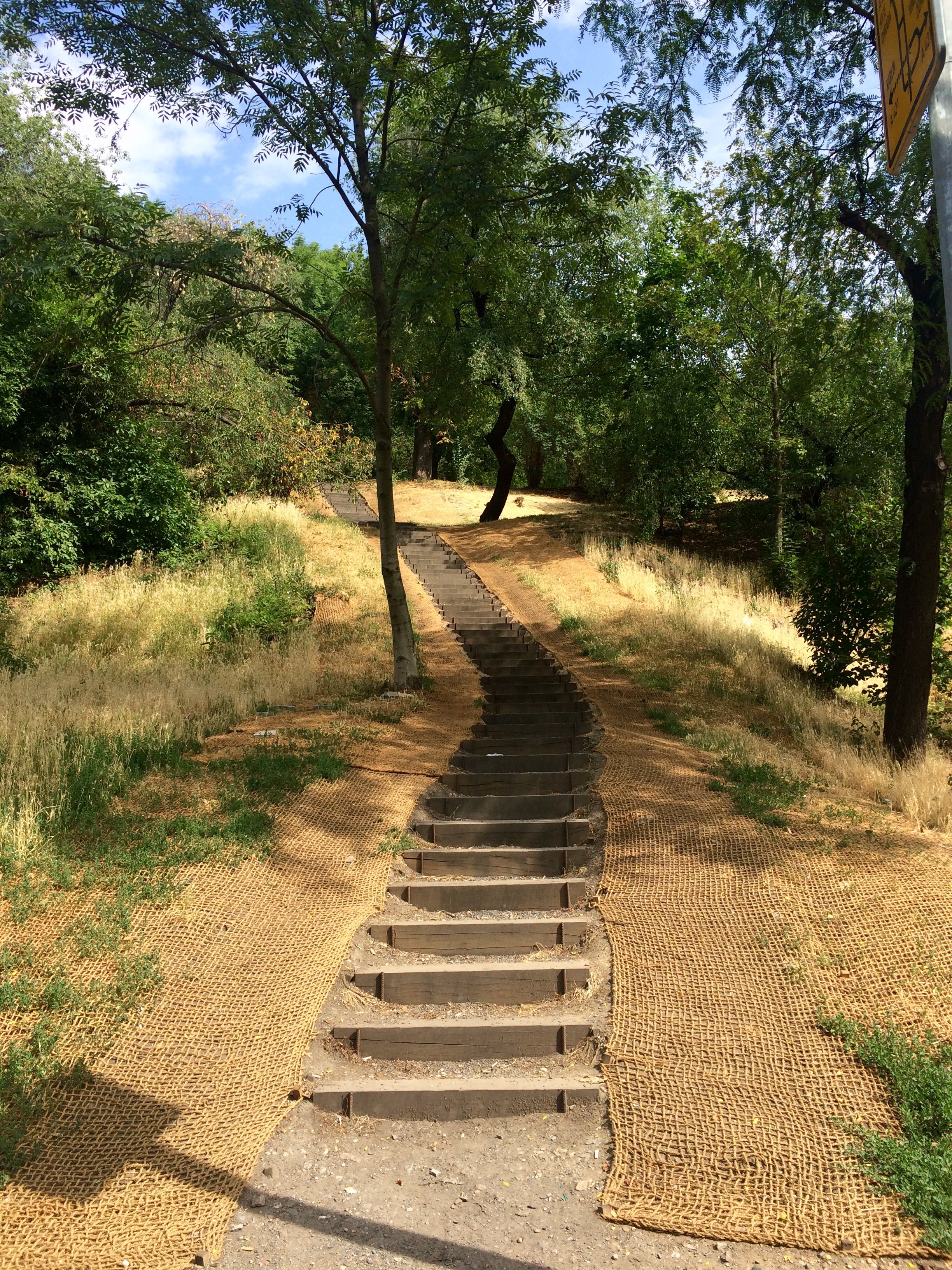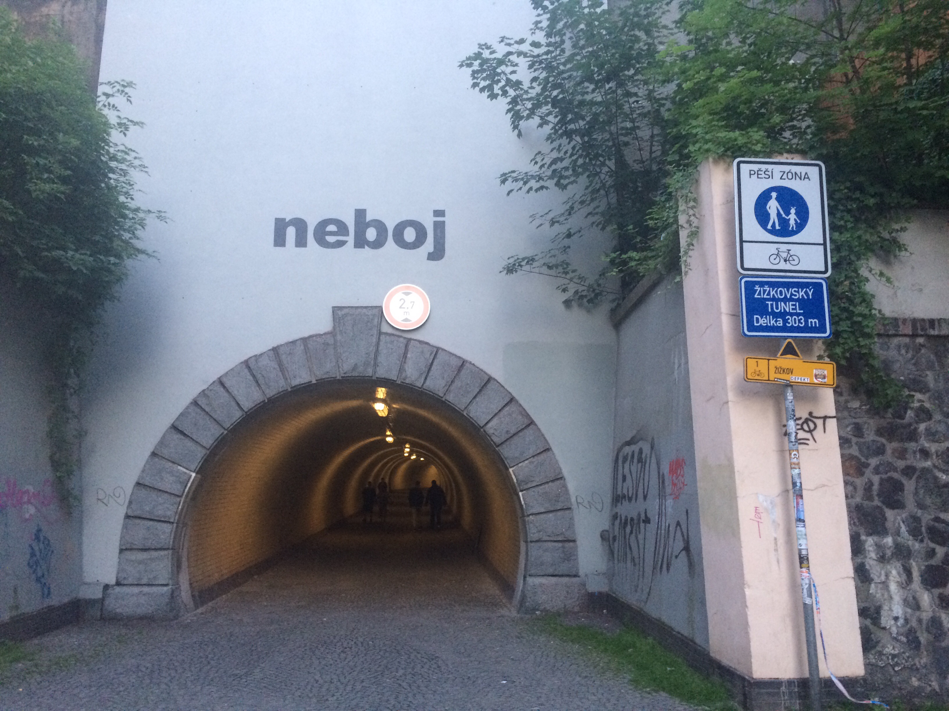 From Žižkov, you go towards the tunnel that leads to Karlín, and take the path up and to the left of the tunnel: