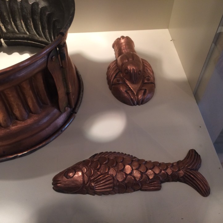 -Dinner was usually served in three courses, two including meats, and with the dessert on the table from the beginning (fruit and sugar were symbols of high social status). Luxurious copper forms, like the fish and lobster above, were used.