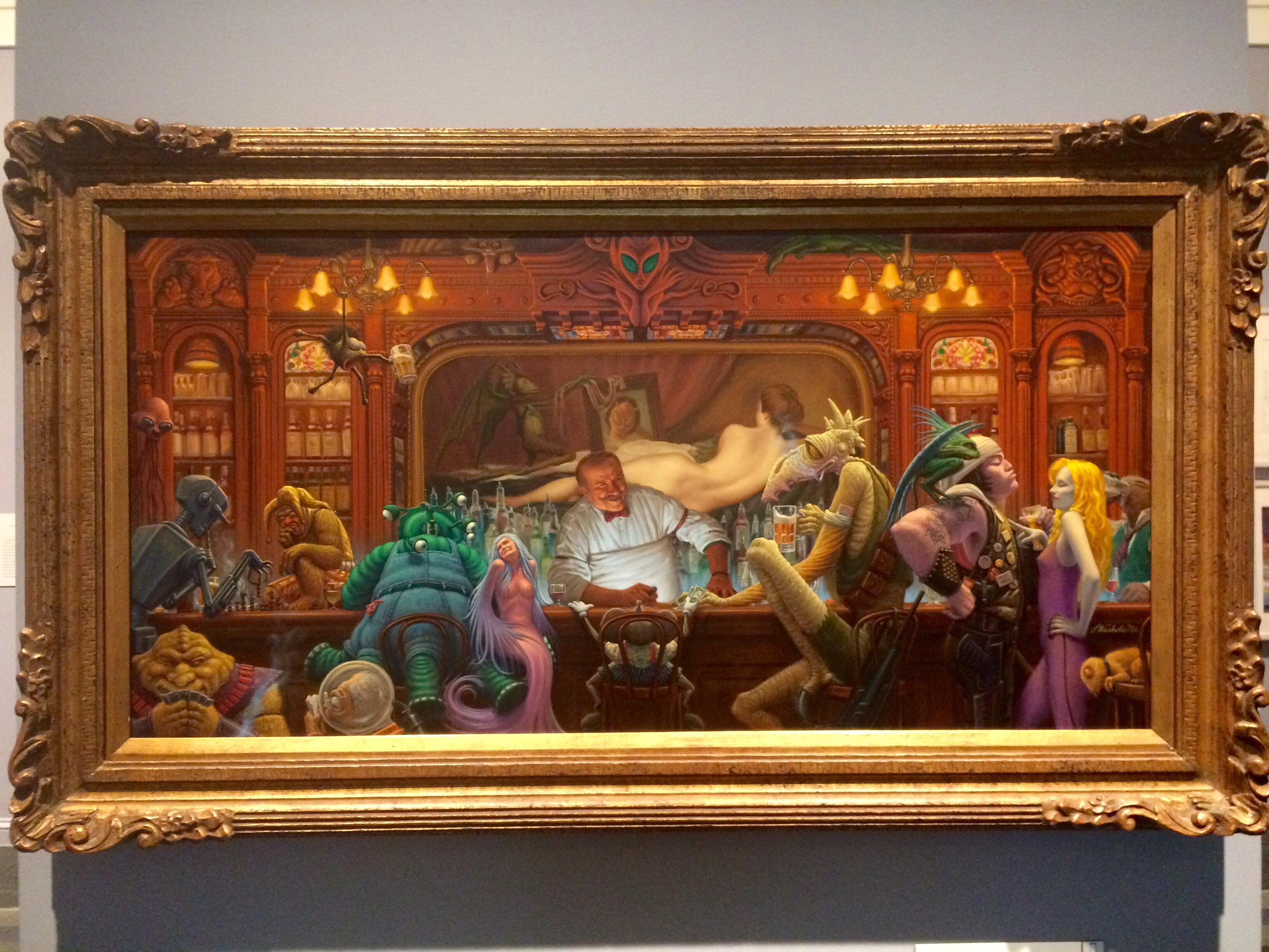 They even had a room filled with the watercolors and oil paintings of James Warhola, Andy Warhol’s nephew! He has had a 40-year long career of illustrating sci-fi, fantasy, and children’s books. Just check out this supernatural gathering in a bar.