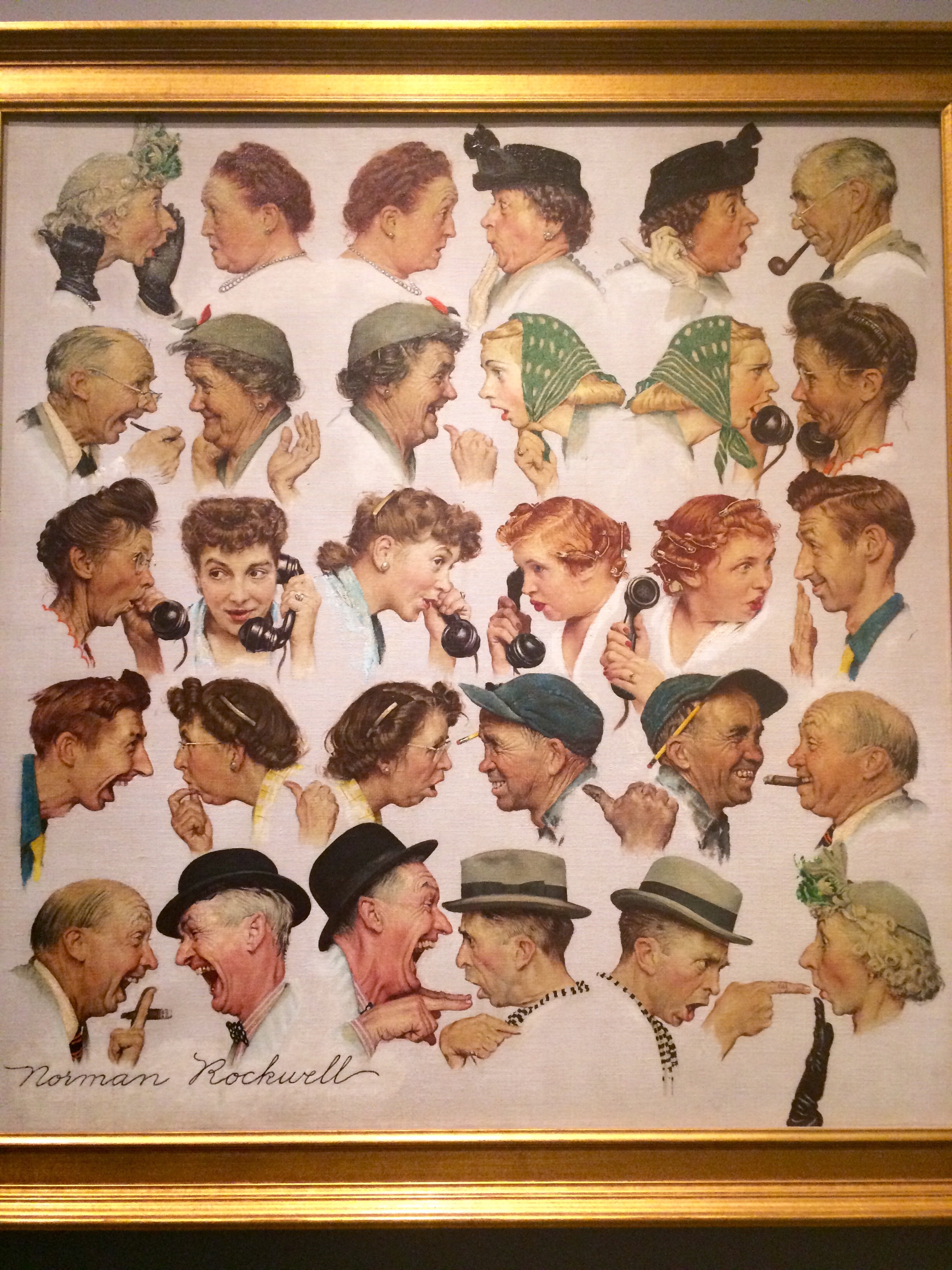 “Gossip” is one of my favorite paintings of his, showing precisely how, and with what glee, gossip spreads – true or not. Rockwell pictures himself in the bottom row, the one wearing the gray hat with the black ribbon. Apparently, the gossip is all about him 😉