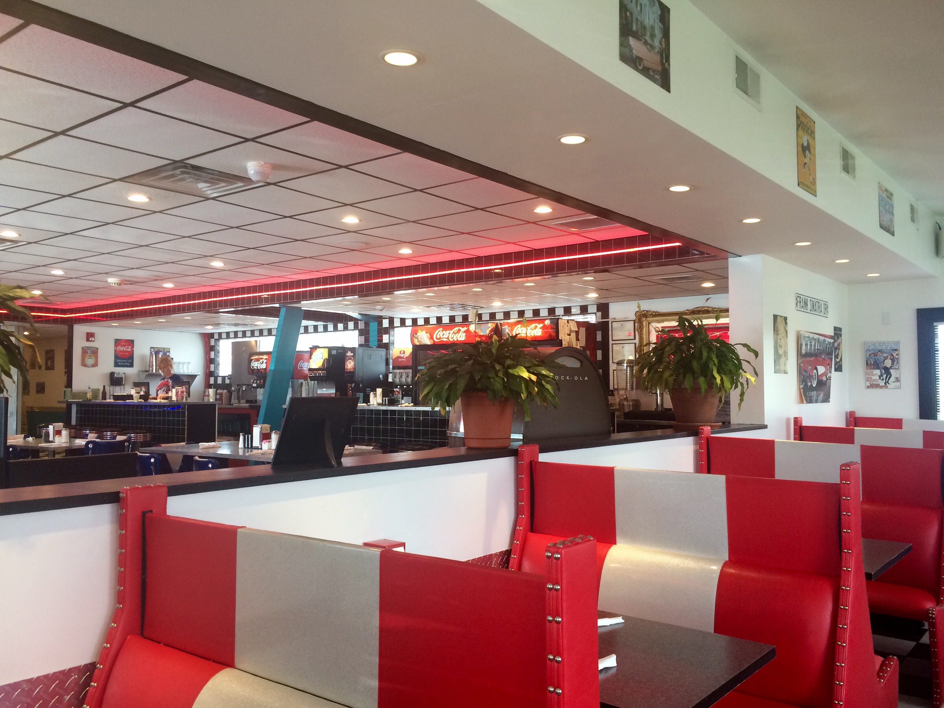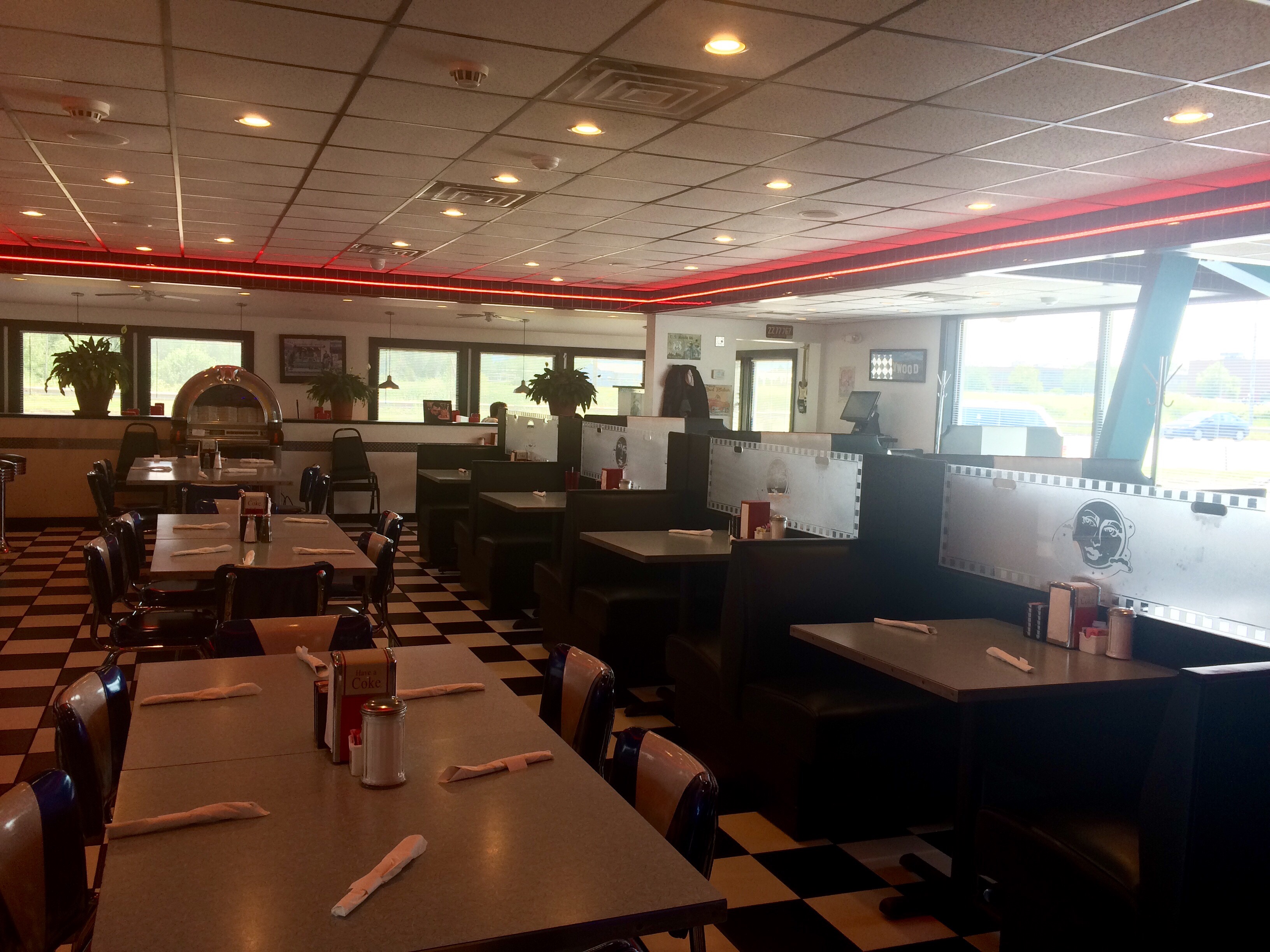 Black and white checkered floors, neon tube lights, red booths and panelling, and complete with Marilyn Monroe and Elvis on the bathroom doors.