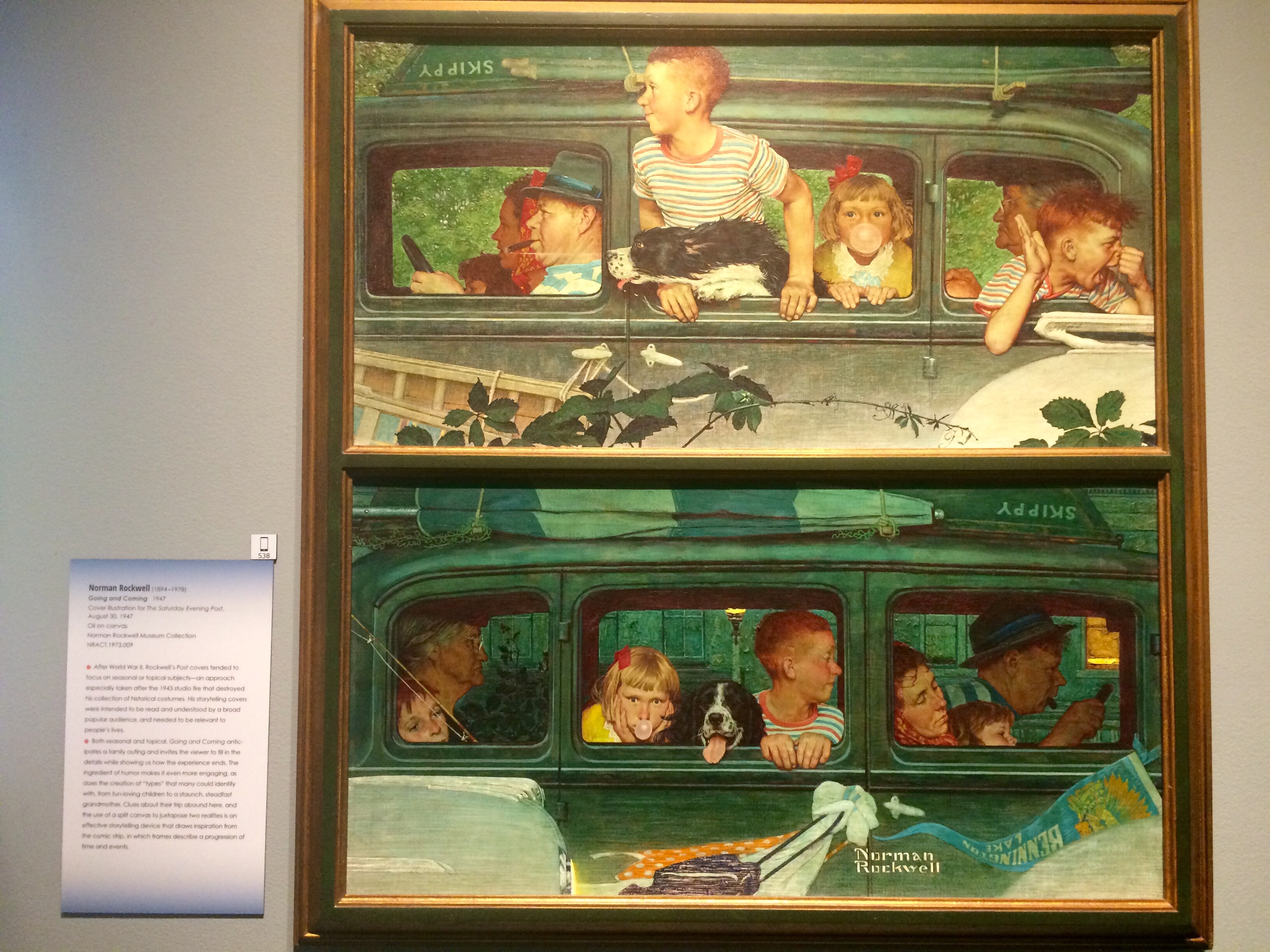 “Going and Coming” shows a common message for anyone who has ever gone on a car trip. In the beginning you’re excited, at the end, just excited to get home. Notice how the staunch grandmother keeps her exact position in both halves.