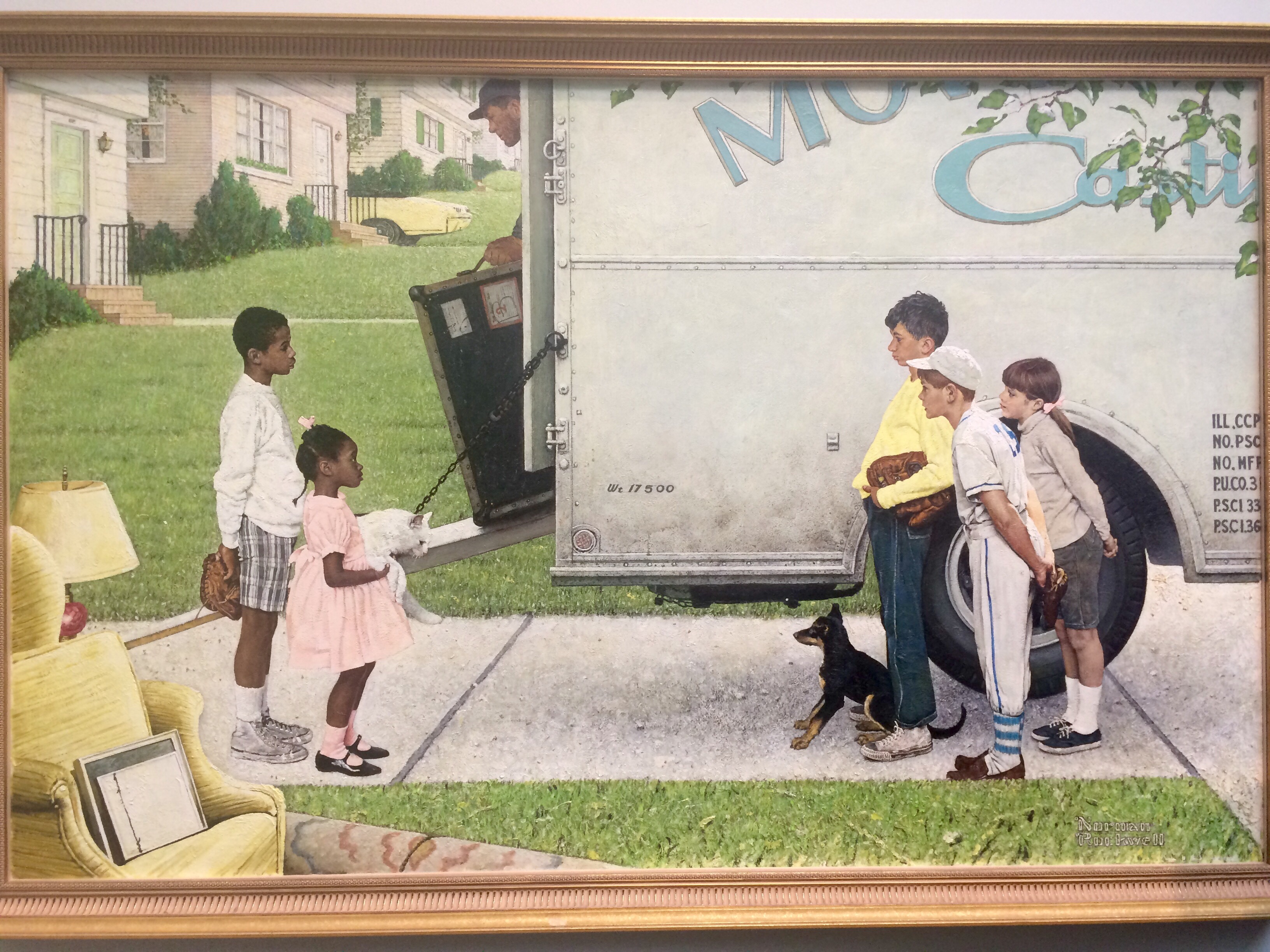 Here, Rockwell shows an African American family moving into a white neighborhood, and the curiosity of the white neighbor children. It doesn’t look like rude or hostile curiosity, which suggests they will become friends; however, if you look closely at the window on the top left, you’ll see someone staring out the window who’s more likely to think it a scandal.