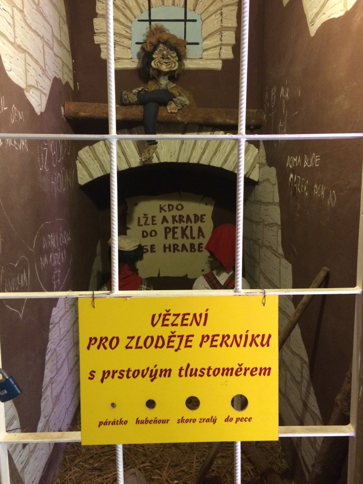 The museum was equipped with all the little details that would scare a young kid into being good, and as all the boys and men transformed into Jeníček and the girls and women into Mařenka, we tried fitting our fingers into this test for gingerbread thieves – if you fit the largest, it’s straight into the oven for you — after, of course, a short stint in prison.