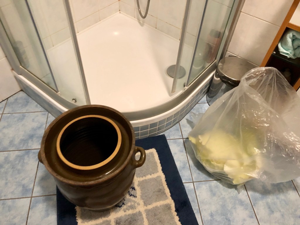 They were fermenting cabbage – which starts with prepping it in the bathtub.