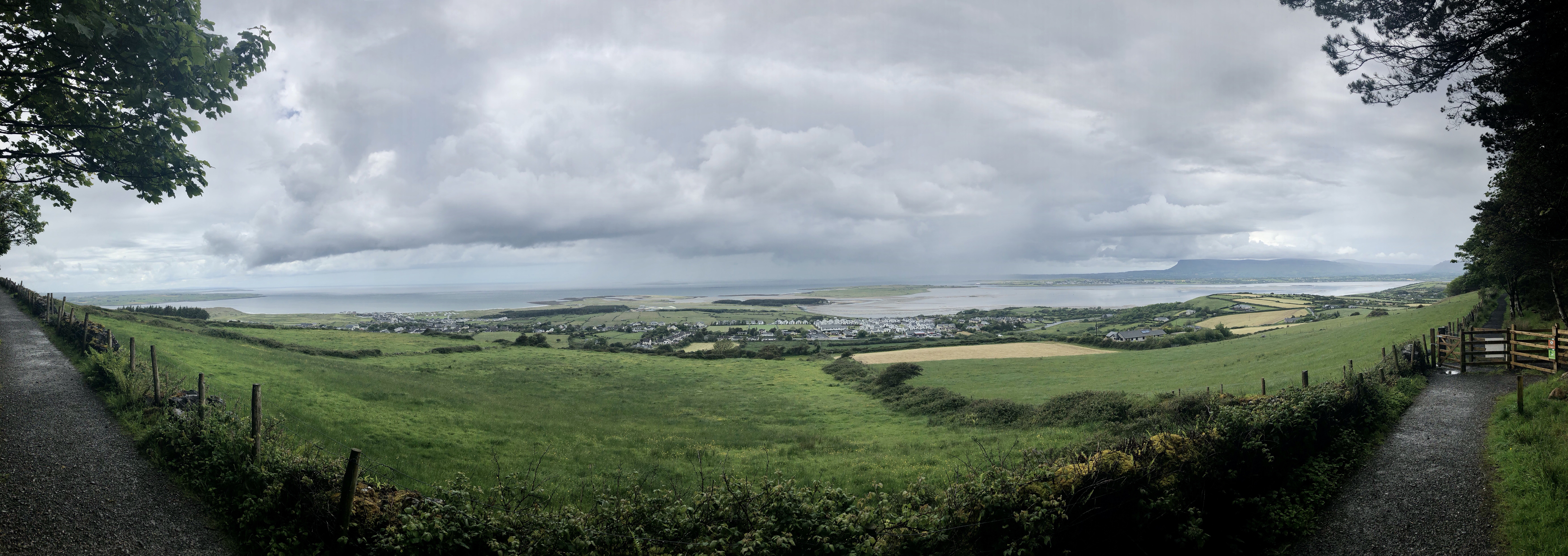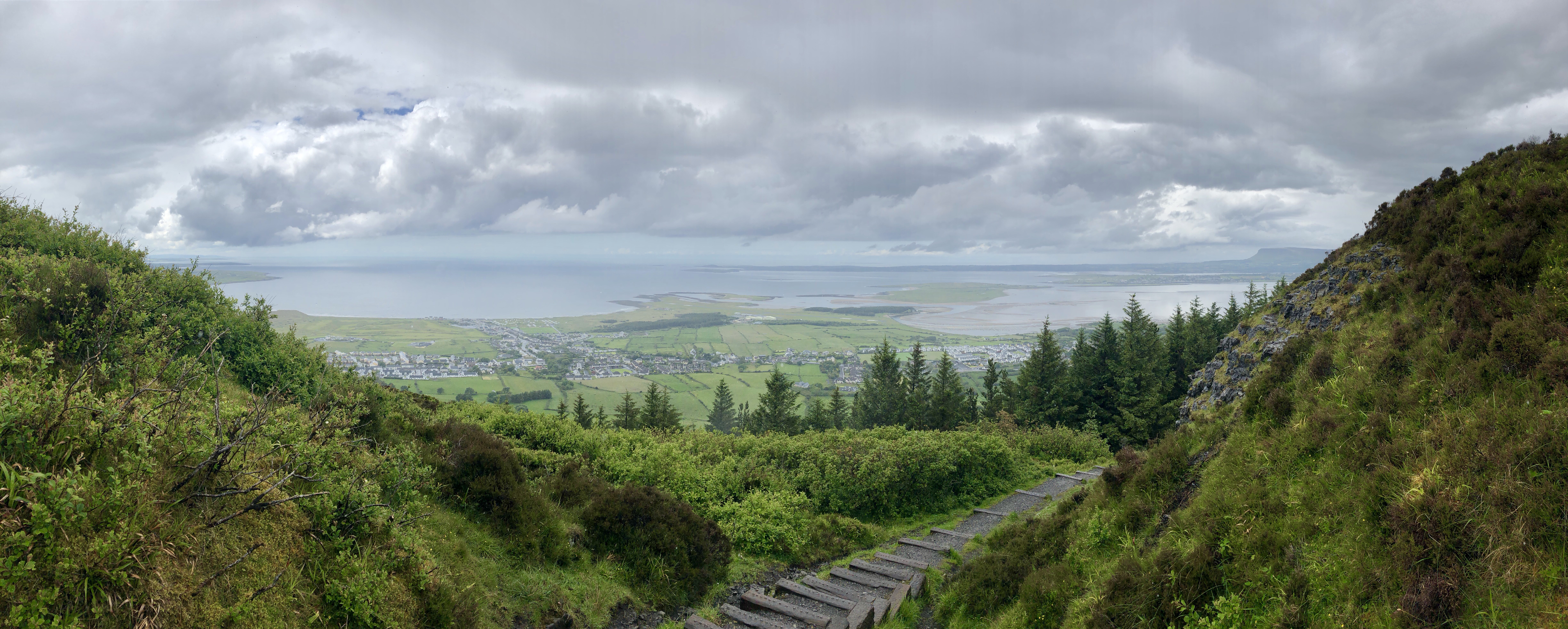 After about 15 minutes, I reached a plateau that seemed to run all along the side of the hill. There was a wooden gate system where I had to open one as I closed another to ensure that the sheep would be kept out. As soon as you’re on the other side of the gate, you’ll see a bench where you can sit and admire the “beginner’s” views over Sligo and Ballisodare Bay. The only one around, I stood on the bench and took some photos, thinking, “This is beautiful,” and “Is this it? That wasn’t an hour.”