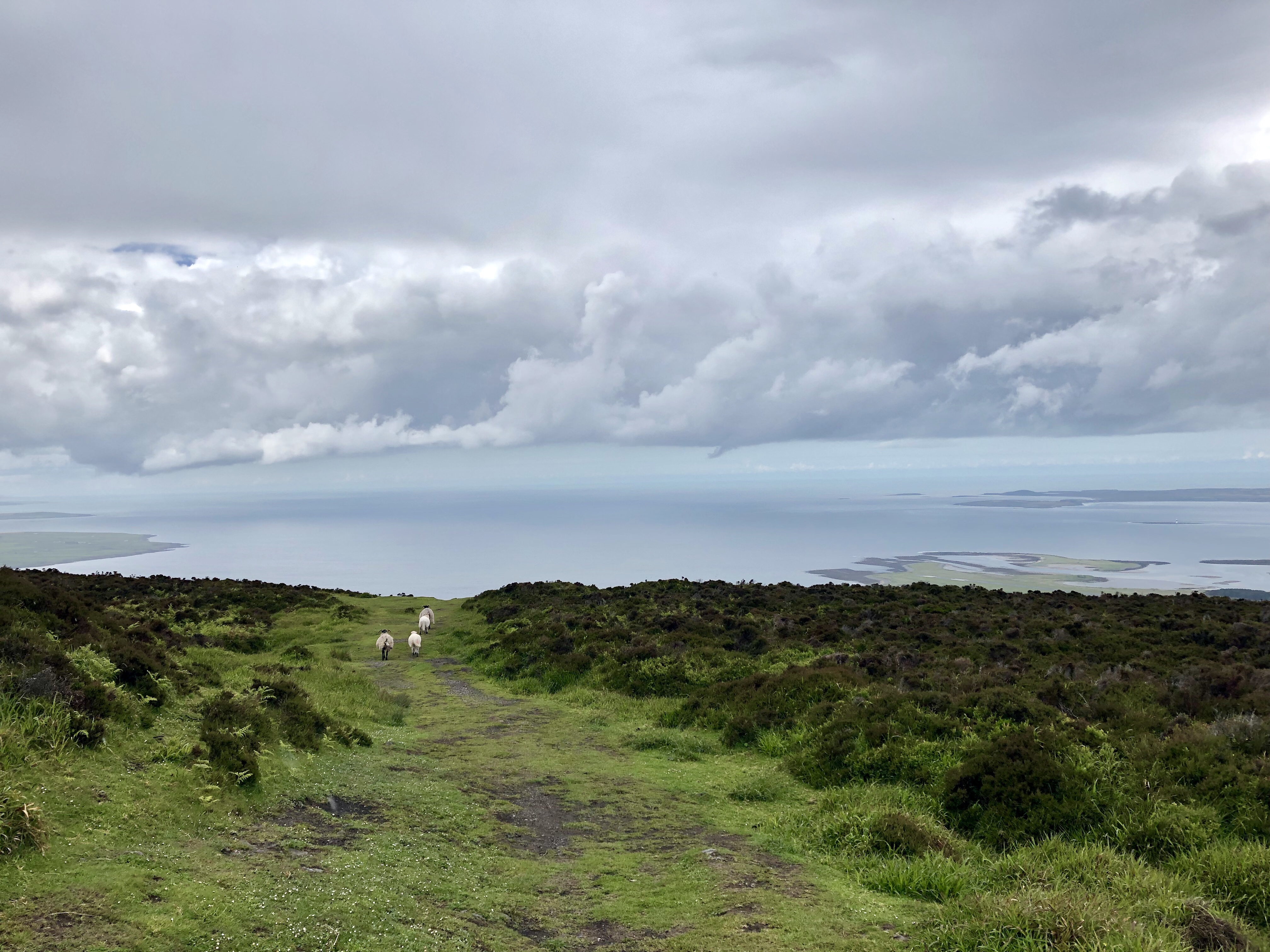 Sure enough, I soon encountered the wooden steps leading up. Now I knew I was in the right place. I stopped every few yards for a photo, capturing every subtle change in the landscape and my view of it. Greenery. “Oceanery.” Far-off mountains. Clouds and sky as far as the eye can see.